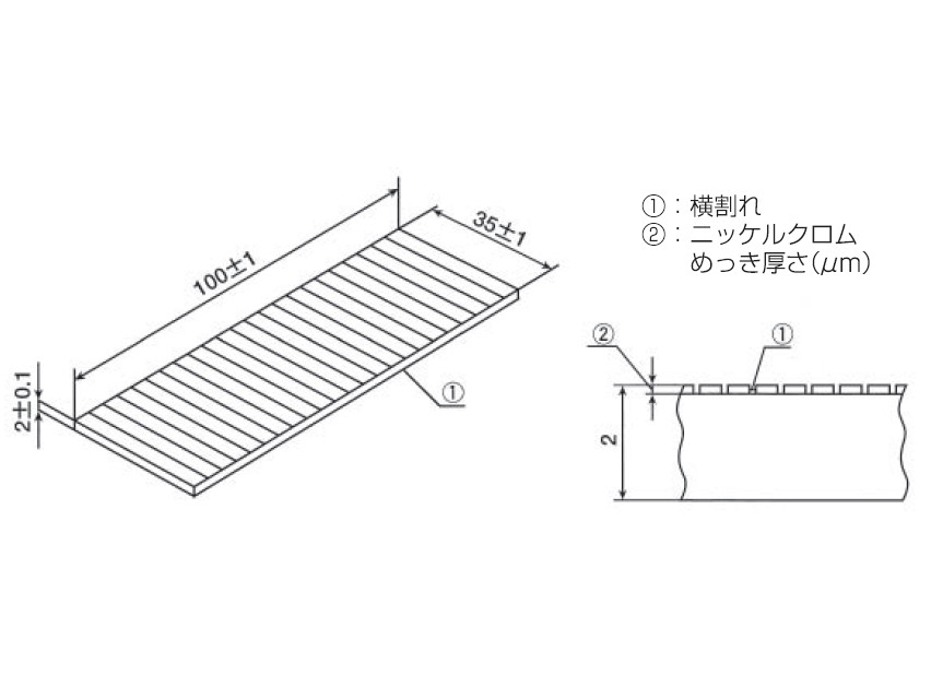 浸透探傷剤の性能比較や確認に使用するメッキ割れ試験片 JIS Z 2343-3に準拠のタイプ1対比試験片です。